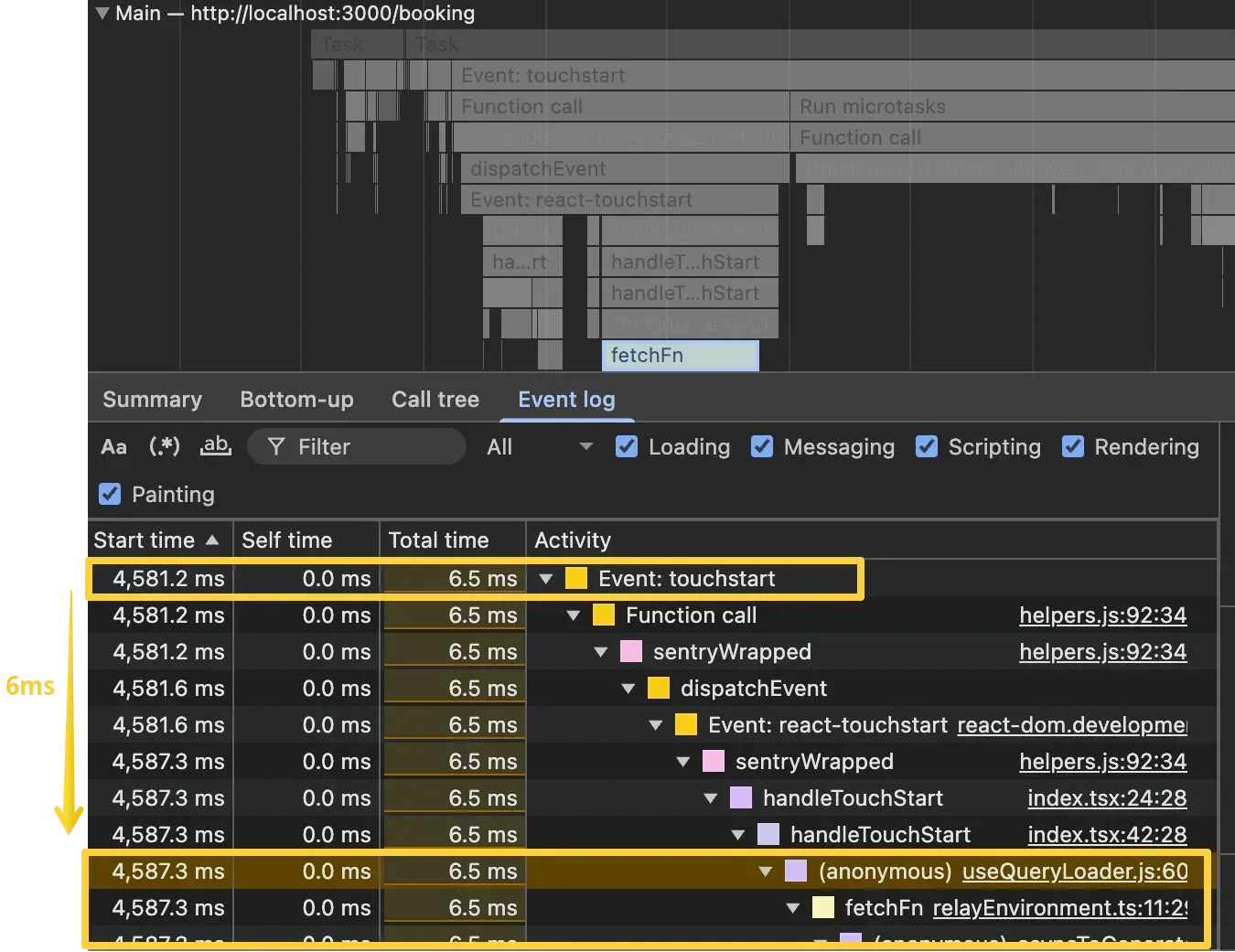 날짜 선택, 클래스 검색결과 렌더링 사이 사용자 이벤트 10ms 내 네트워크 요청 시작 기존 대비 71% 응답성 개선