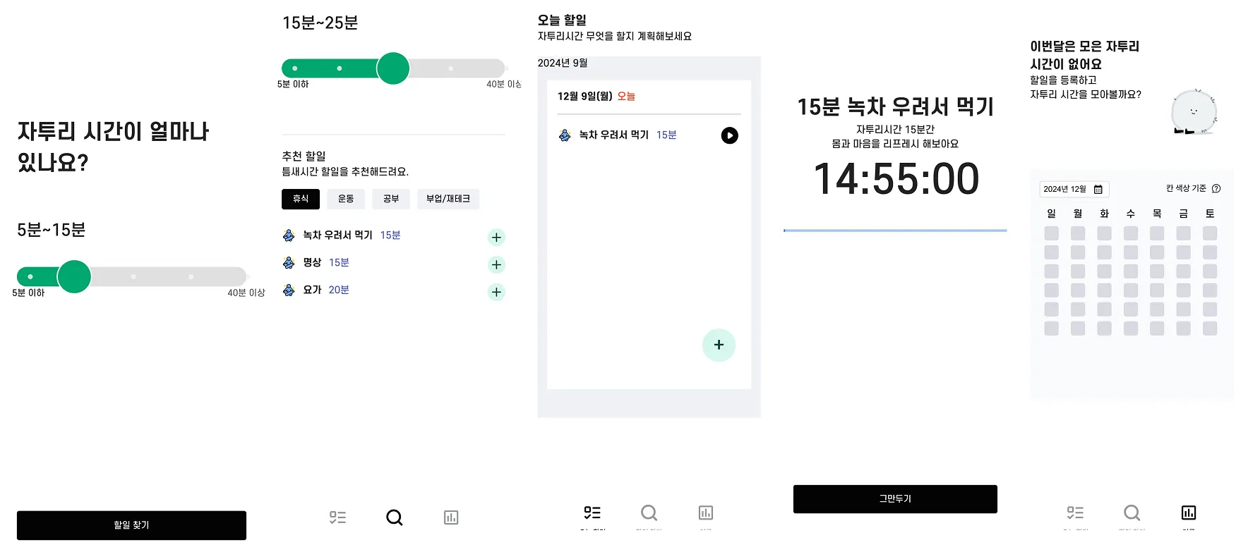 자투리 시간에 지금 할 수 있는 일을 추천해주고, 완료한 일은 자동으로 캘린더에 기록해 나만의 생산성 패턴을 시각화 해주는 모바일 웹 서비스 입니다. 해당프로젝트는 카카오 개발자(테오)가 진행하는 협업 프로젝트로 Google Sprint 방식을 결합해 빠르게 아이디어 구상부터 MVP를 만들어 내는데 목표합니다.