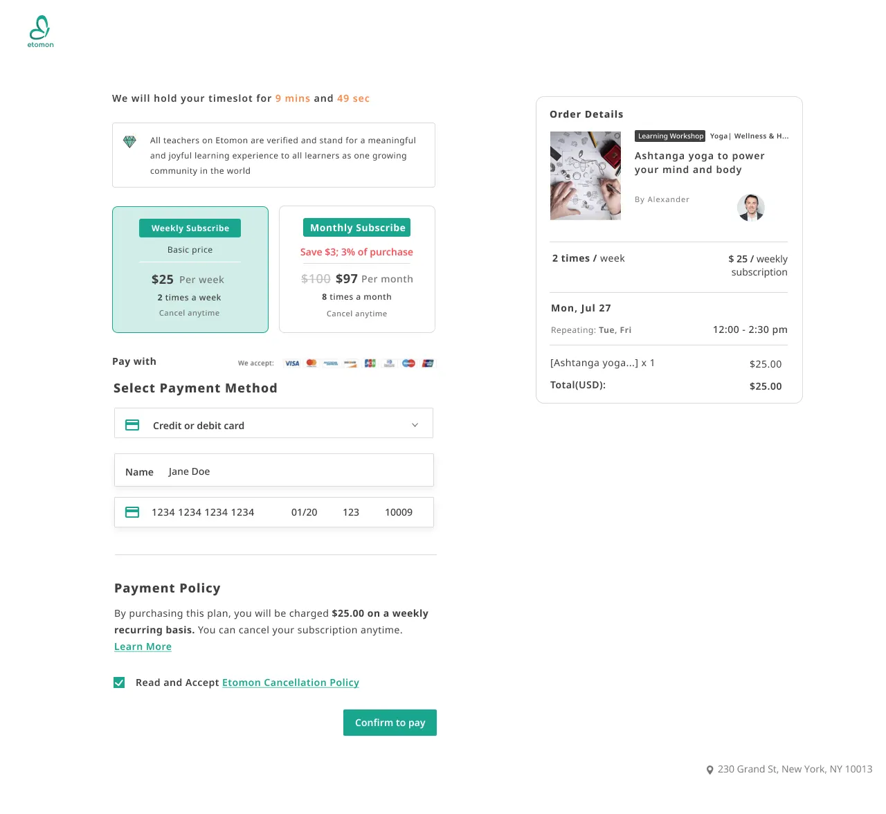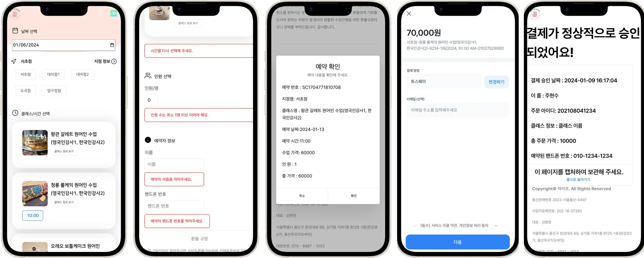 사용자 주문 웹페이지 내 클래스 리스트 필터링, 타임슬롯 선택, 예약 정보 입력, 약관 동의, Toss 결제 연동, 예약 후 kakao알림 등 전체 예약/결제 흐름 구현